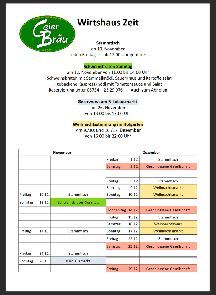 Wir legen sehr viel Wert auf Qualität und machen alle unsere Speisen selbst. Im Biergarten gibts hausgemachte bayrische Brotzeiten und Grillage, im Wirtshaus bieten wir wechselnde Tagesgerichte und Stammgerichte